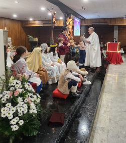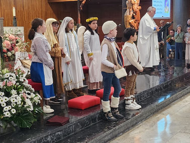 24 de diciembre celebramos la misa de navidad donde los niños de catequesis representan el nacimiento de Jesús